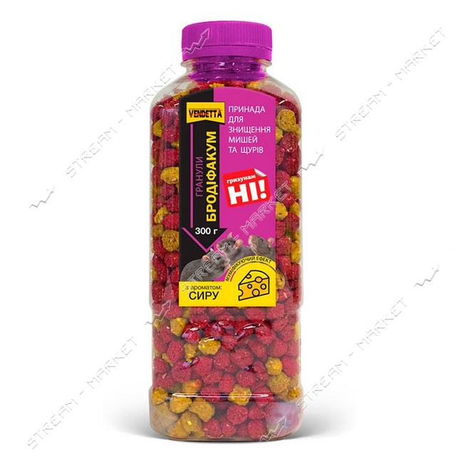 Зустрічайте потужний засіб у боротьбі з гризунами - Бродифакум у вигляді гранул зі смаком сиру. Це високоякісний і ефективний продукт для безпечного та надійного знищення гризунів на сучасному ринку. Бродифакум швидко та бездоганно впорається зі своїм завданням, позбавляючи вас від гризунів всього за кілька днів. Використання гранул відрізняється простотою та зручністю - просто розмістіть на траєкторії руху гризунів та дочекайтеся результату. Продукт абсолютно безпечний для домашніх тварин та людей за дотриманням правил використання. Смак апетитних гранул легко приваблює гризунів, забезпечуючи швидкий ефект. Не дозволяйте гризунам зіпсувати ваше життя. Бродифакум - це ваш надійний помічник у боротьбі з ними.