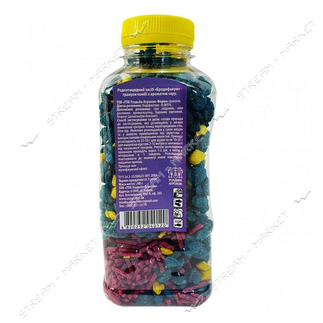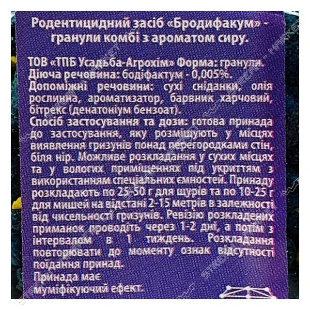 Представляємо ультраефективний засіб для знищення гризунів - "Бродифакум" Комбі в гранулах. Сирний смак забезпечує максимальну привабливість для шкідників, а активна речовина надійно вирішує проблему гризунів. Гранули з сирним смаком відразу привертають увагу гризунів, що гарантує результативність застосування засобу. Засіб "Бродифакум" безпечніший для домашніх тварин, ніж багато інших родентицидів. "Бродифакум" вартий своїх грошей, адже він гарантовано знищує гризунів, які завдають шкоди вашому дому або саду. Час позбутися від гризунів! Придбайте "Бродифакум" вже зараз і забезпечте своєму дому мир і спокій!