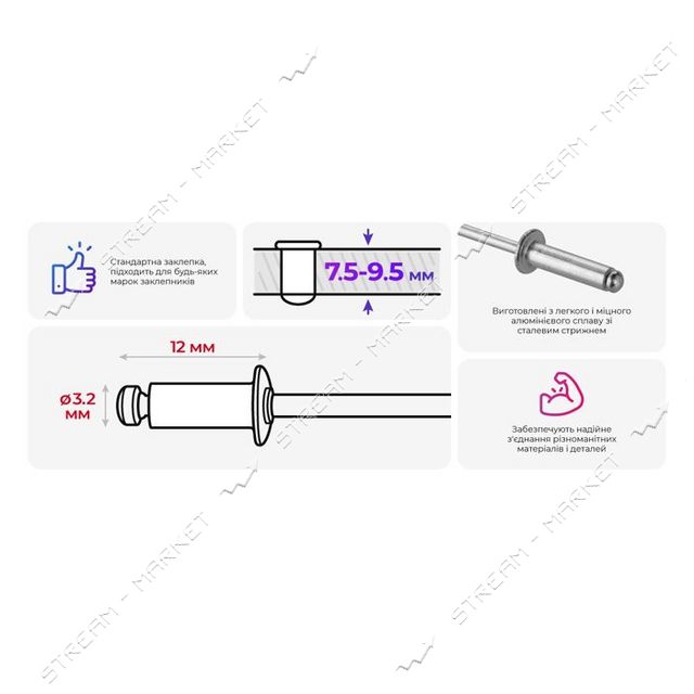 Заклепка Intertool RT-3212 алюмінієва 3.2х12мм