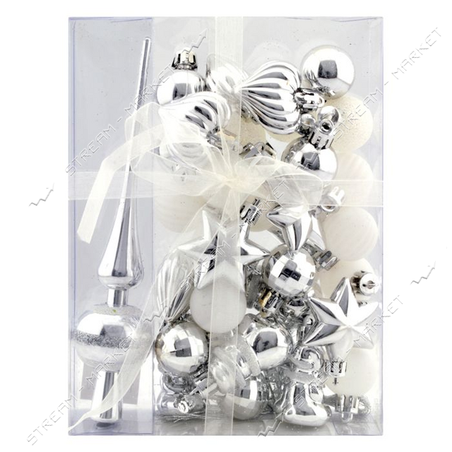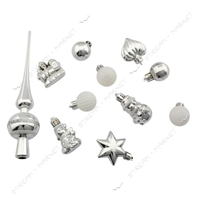 Набір новорічних пластикових іграшок ВАТ-300 33шт плюс верхівка срібно-білий
