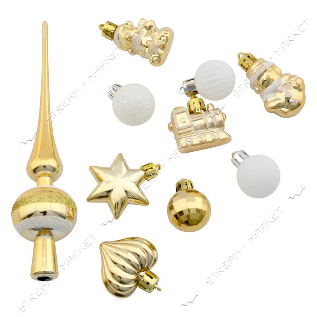 Набір новорічних пластикових іграшок ВАТ-300 33шт плюс верхівка золото-білий