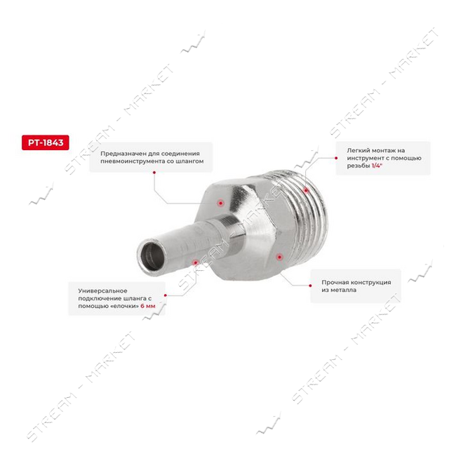 Переходник с наружной резьбой Intertool PT-1843 1/4" на шланг 6мм оптом по самой выгодной цене в Украине! Компания Stream Market: Харьков, Киев. тел: 067-624-49-19.
