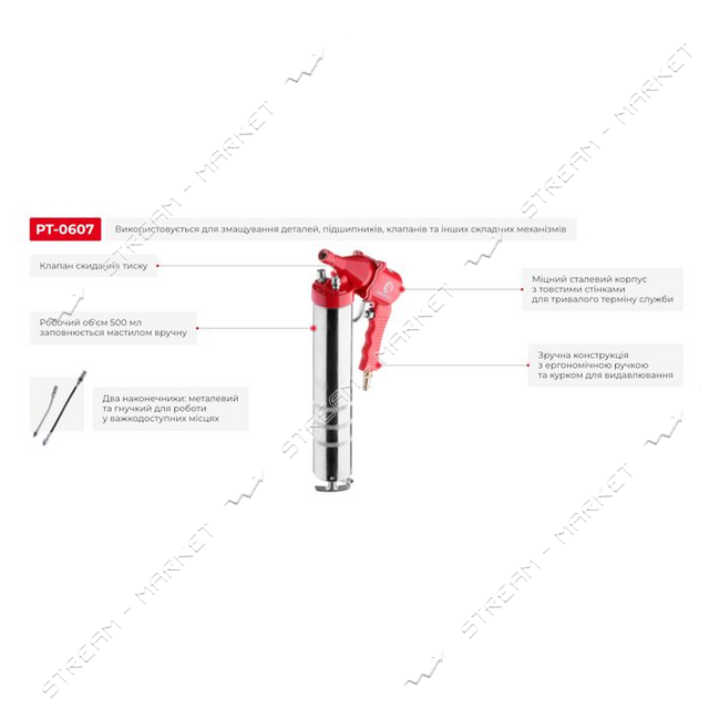 Пневматический пистолет INTERTOOL PT-0607 предназначен для выдавливания смазки с помощью сжатого воздуха. Пистолет оснащен двумя насадками, что позволяет выбирать оптимальный вариант для конкретной задачи. Компактный и удобный в использовании, он идеально подходит для профессионального использования в авто-сервисах, производственных цехах и гаражах. Простой в обслуживании и надежный в эксплуатации, этот пистолет станет незаменимым помощником при обслуживании оборудования и механизмов. Вес - 0, 9 кг, давление воздуха - 90 PSI.
