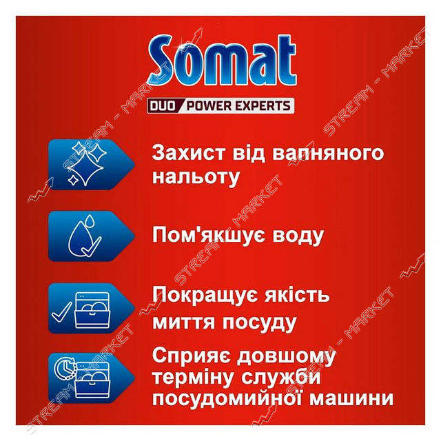 Обеспечить более качественное машинное мытье посуды, защитив технику от поломки можно используя соль "Somat Тройное действие". Действие соли способствует бесперебойной работе системы смягчения воды, тем самым усиливая эффективность моющих средств для посуды. В таком случае очищение кухонного инвентаря происходит эффективнее, а посудомоечная машина защищена от образования известкового налета. Соль "Somat Тройное действие" следует насыпать в специальный отсек, согласно инструкции к посудомоечной машине. Покупка соли для смягчения воды "Somat Тройное действие" продлевает срок службы деталей машины, защищая владельца от неожиданных трат на ремонт техники.