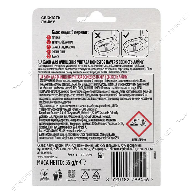 Туалетный блок для унитаза Domestos Power 5 Свежесть Лайма 55г
