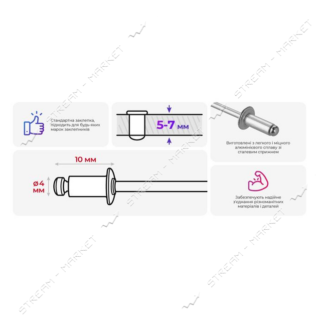 Диаметр, мм: 4, Длина, мм: 10, Материал: Алюминий, Производитель: Intertool, Тип: Заклёпки, Фасовка, шт: 50,