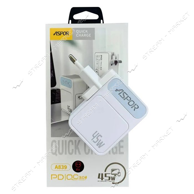 Зарядний пристрій Aspor A839 PD 45W USB/USB-C/5A білий оптом за самою вигідною ціною в Україні! Компанія Stream Market: Харків, Київ. тел: 067-624-49-19.