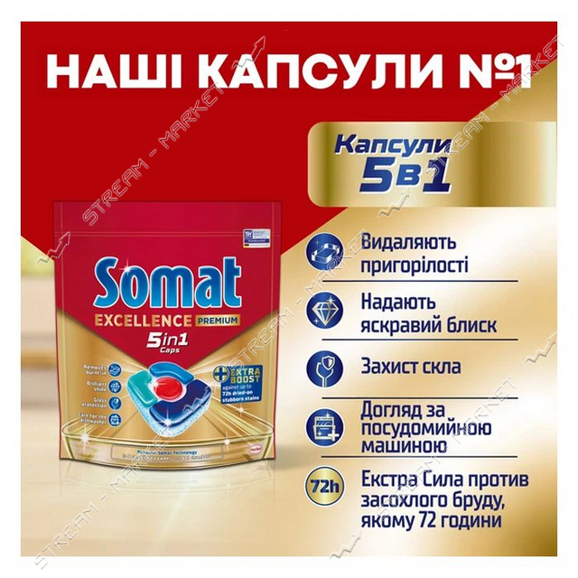 Відкрийте для себе ідеальну чистоту та блиск вашого посуду з Somat Excellence 5в1. Ці потужні капсули розроблені спеціально для тих, хто цінує бездоганний результат без зайвих зусиль. Еволюційна формула не тільки видаляє навіть найстійкіші забруднення, але й захищає посудомийну машину, подовжуючи її термін служби. Швидкорозчинна формула забезпечує миттєву дію, заощаджуючи ваш час та ресурси. Унікальна технологія видалення плям гарантує, що ваш посуд залишиться сяючим після кожного циклу. Формула створена з турботою про природу, мінімізуючи вплив на навколишнє середовище. Кожна капсула містить компоненти, що запобігають корозії. Замовте Somat Excellence 5в1 вже сьогодні та переконайтеся в його ефективності самі!